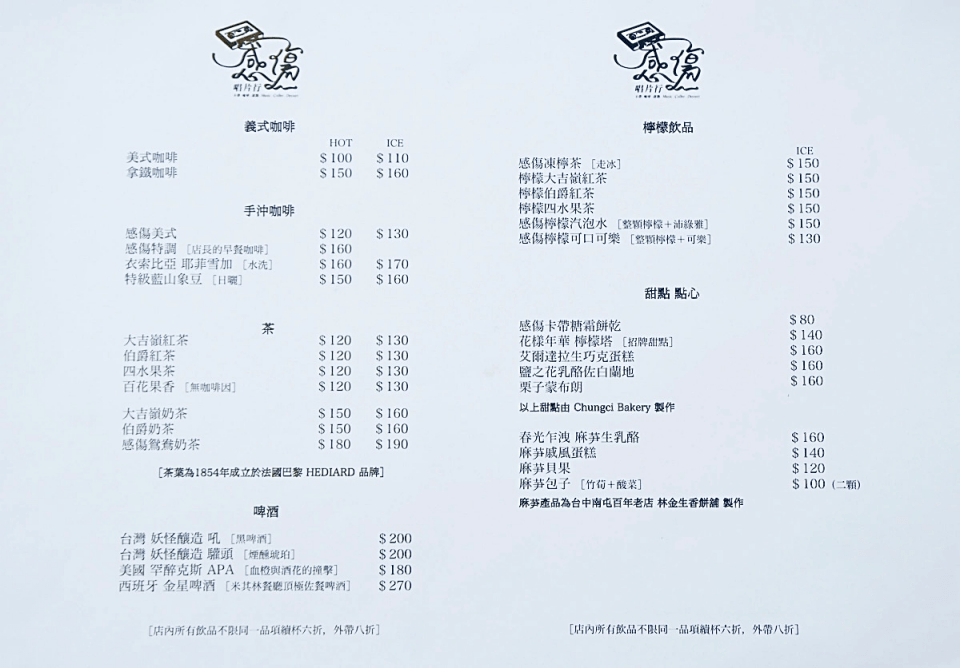 「感傷唱片行」有提供咖啡、茶、啤酒、特色檸檬飲品及甜點等,價格約$100~200,且店內飲品不限同品項續杯,還能6折優惠,外帶8折,不限時可以坐上一整天,太讚啦~